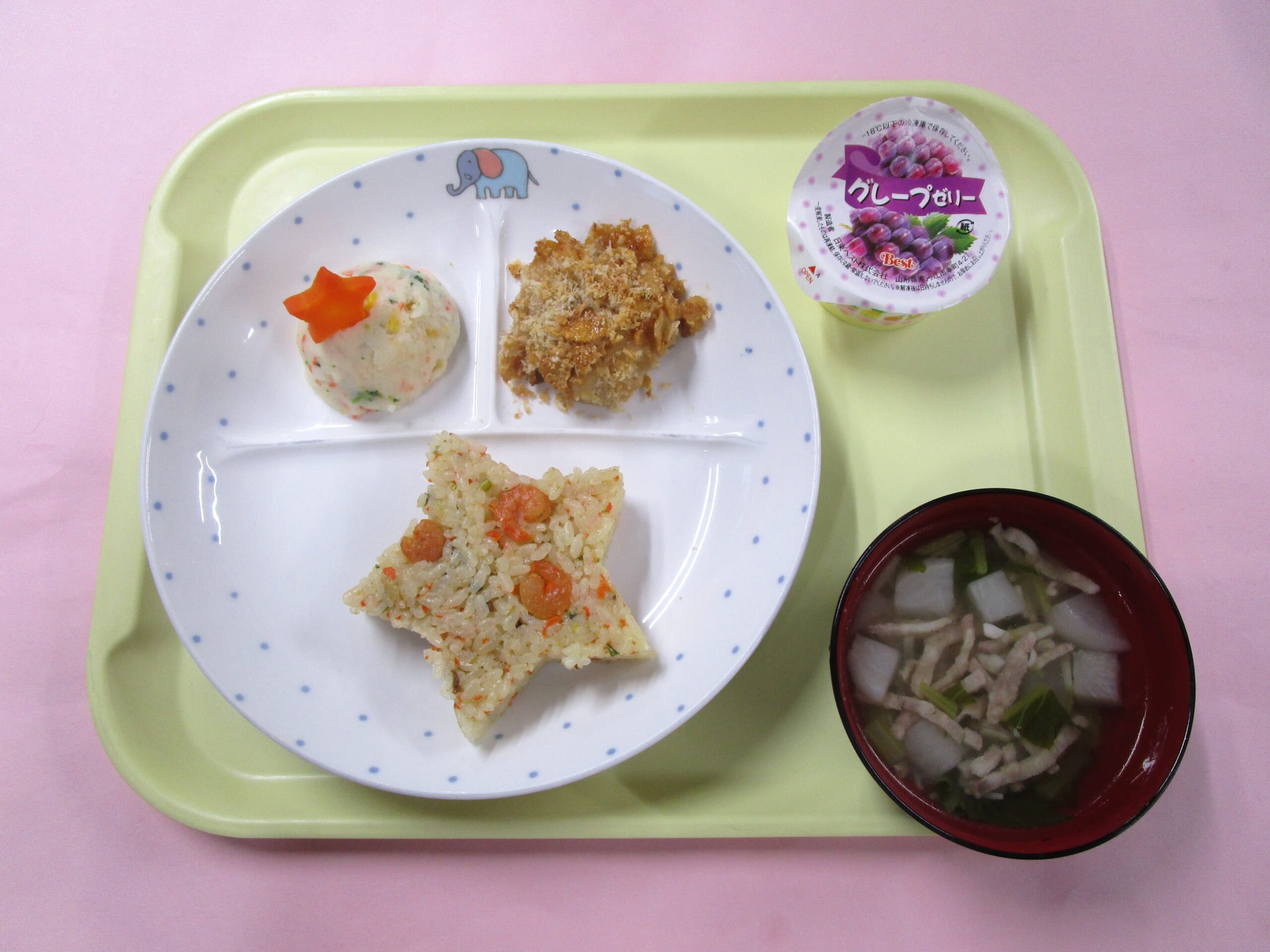 2025年12月は、ケチャップライスランチ♪ 2026 1/05 誕生会メニュー 2026年1月5日2026年1月6日 今月の誕生会メニューは、ケチャップライスランチ♪です。 お星さまのエビピラフを食べながら、サンタさんの話で盛り上がっていました♪ 出羽こども園の給食の特色は? アレルギー対策もOK! 食器は全て強化磁器で安全! 献立は、オリジナル! 配膳も自分たちで! 出羽こども園の給食の特色は? 誕生会メニュー