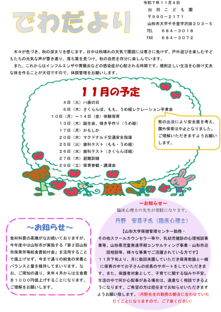 木々が色づき、秋の深まりを感じます。日中は秋晴れの天気で園庭には寒さに負けず、戸外遊びを楽しむ子どもたちの元気な声が響き渡り、落ち葉を見つけ、秋の自然を存分に楽しんでいます。また、これからはインフルエンザや胃腸炎などの感染症が心配される時期です。規則正しい生活を心掛け丈夫な体を作ることが大切ですので、体調管理をお願いします。 -